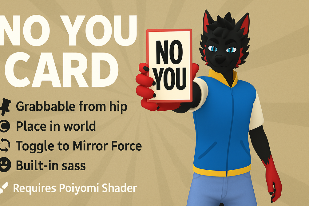 A hilarious βNo Youβ card prop for VRChat avatarsβperfect for shutting down mirror dwellers with style. Easily toggles into a Mirror Force parody card for max dramatic effect. Comes with Poiyomi shader support, world-placement, and hip-grab interaction. Add some sass to your avatar today